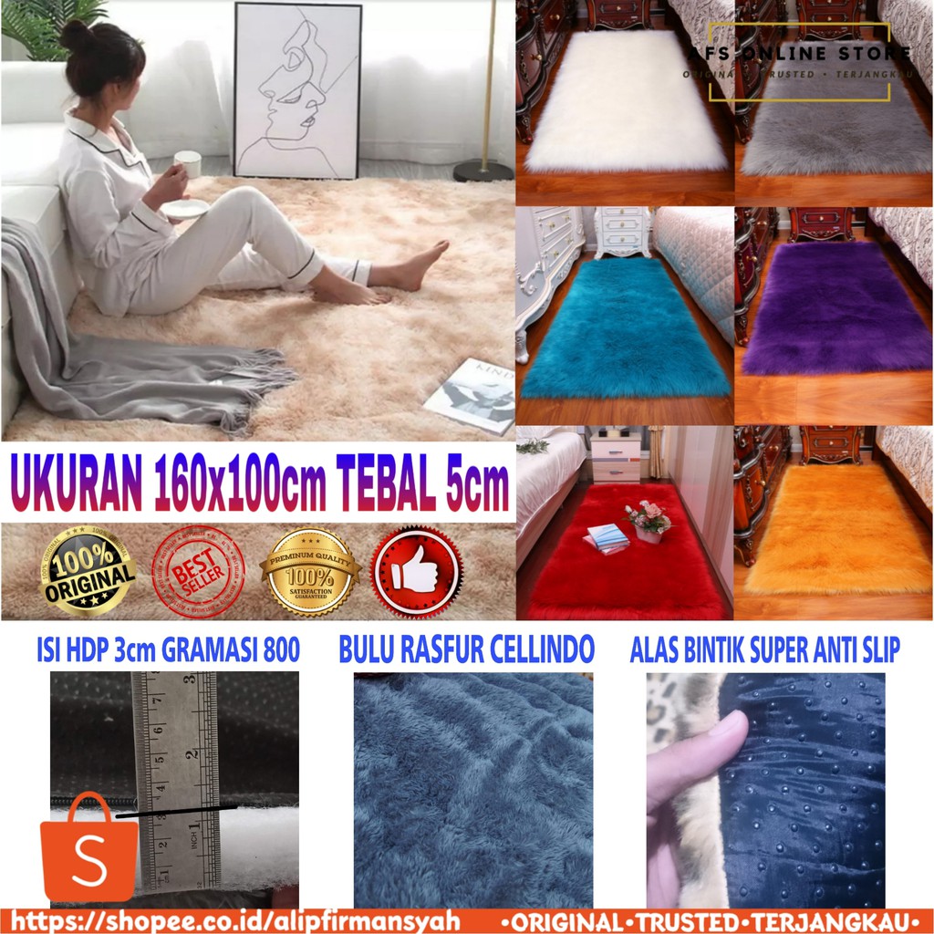 Busa tebal, bulu kuat, halus, dan lembut. Bahannya halus, tidak rapuh (rontok), hangat ketika dipakai, dan bisa menyerap air. Karpet bulu tipe polypropylene dibuat dari bahan sintetis dan tekstur bulunya cukup halus. Karpet bulu rasfur kamar tidur domba ukuran 103x165 tebal 5,5cm keren: Kamu bisa beli barang tadi secara online di bukalapak dengan berbagai macam pilihan warna, ukuran dan juga bahan.